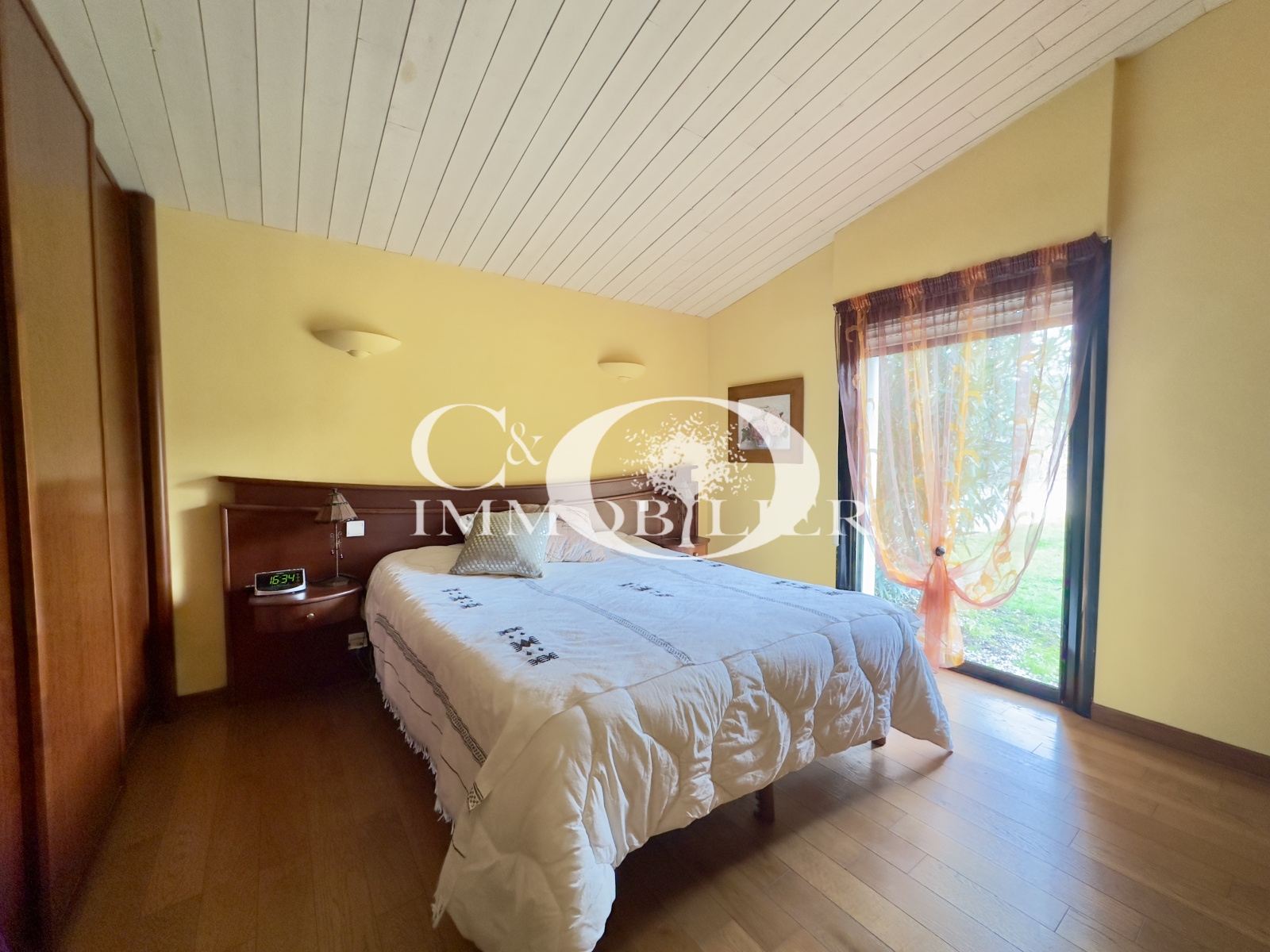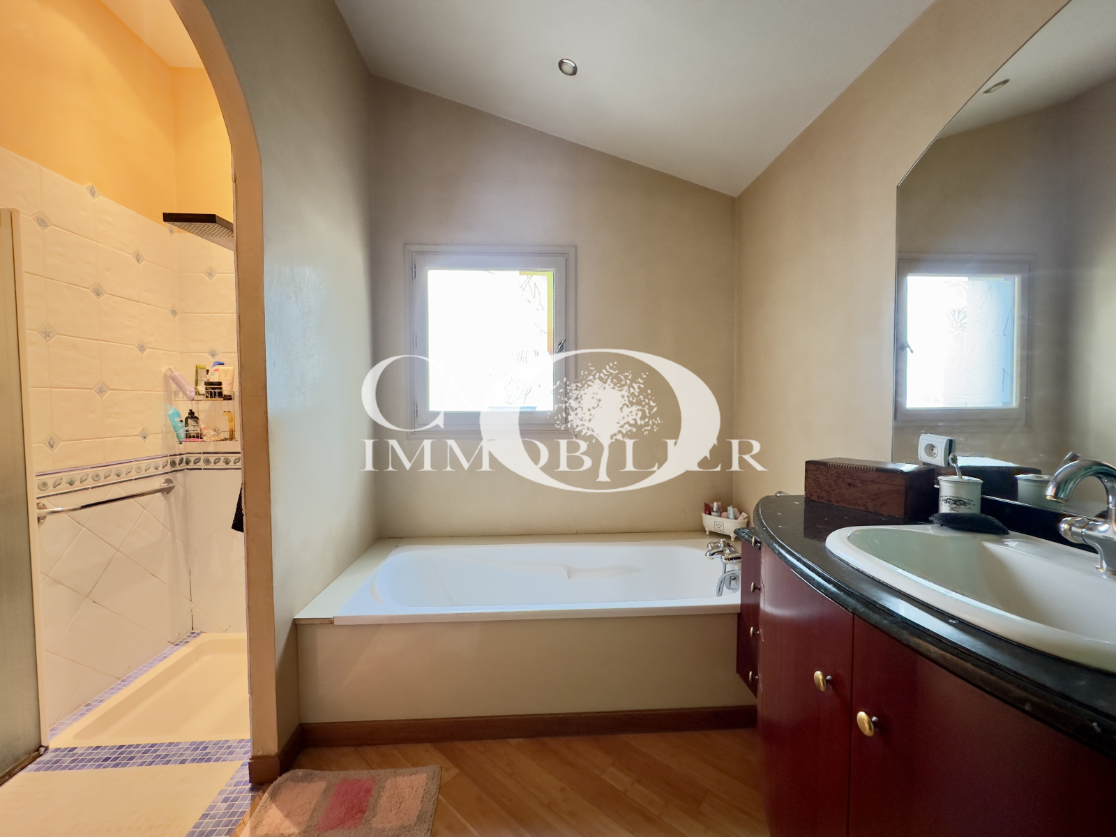 Côté nuit, la maison est pensée pour garantir confort et indépendance : une suite parentale avec salle de bain privative se trouve d’un côté, tandis que deux autres chambres avec salle d’eau et WC sont situées à l’opposé. Une quatrième pièce, pouvant servir de bureau ou de chambre d’appoint, vient compléter l’ensemble.
