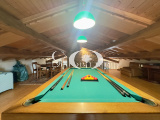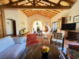 L’espace de vie se compose d’un vaste séjour lumineux avec cheminée et mezzanine, d’une cuisine aménagée de 27 m² environ.