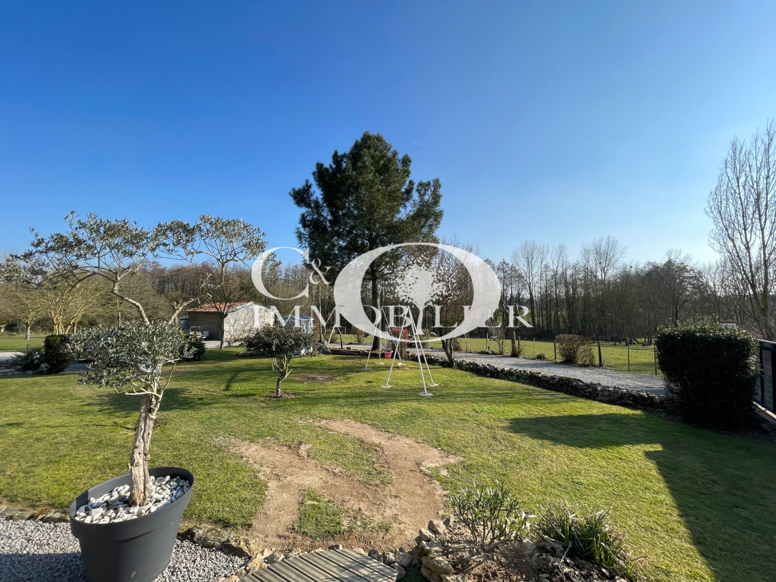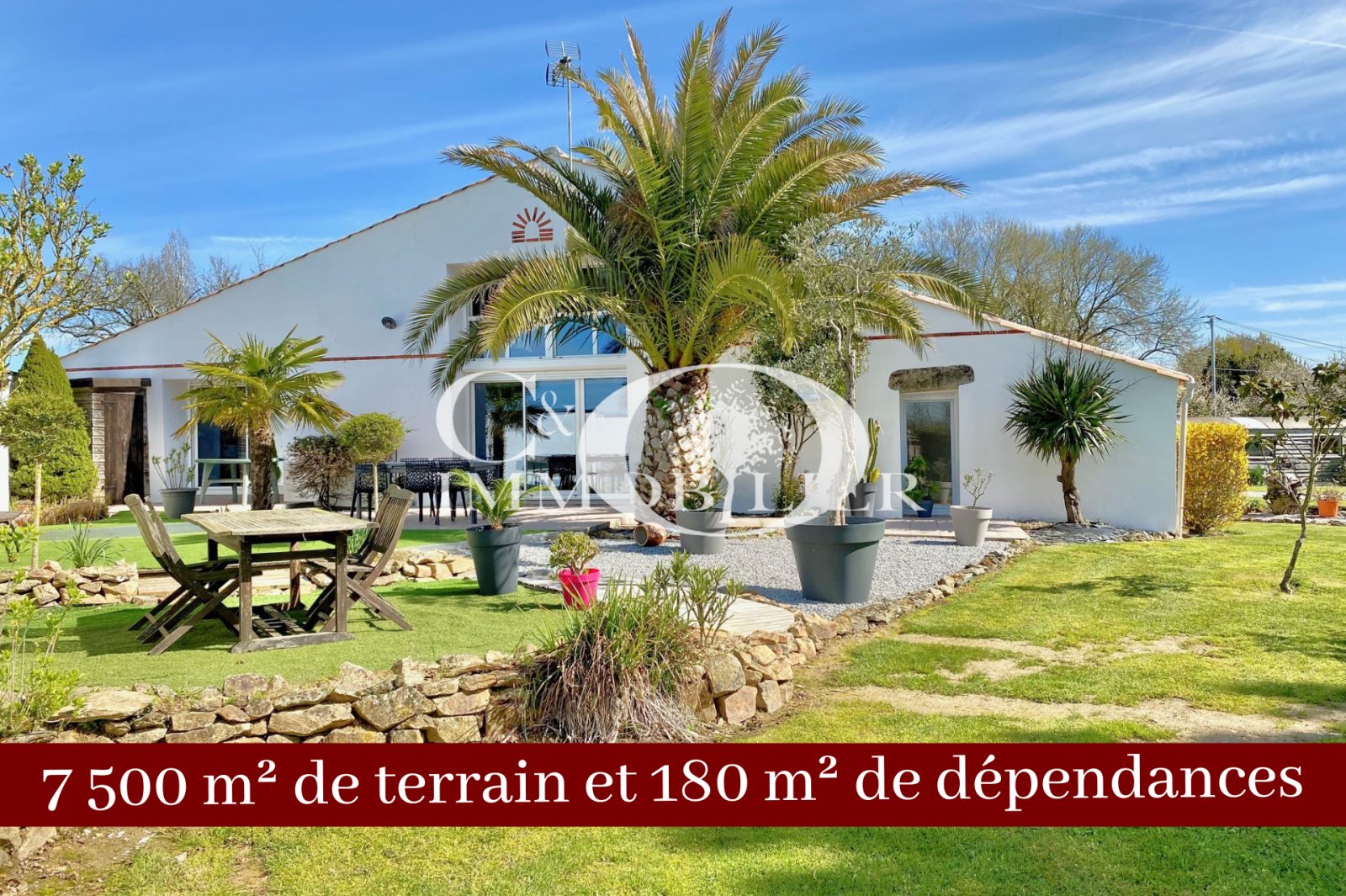 Le tout sur un terrain clos et arboré de 7 500 m² environ avec une terrasse et 180 m² de dépendances incluant un garage, une cave et un atelier attenants, ainsi qu'un hangar à camping-car non attenant.