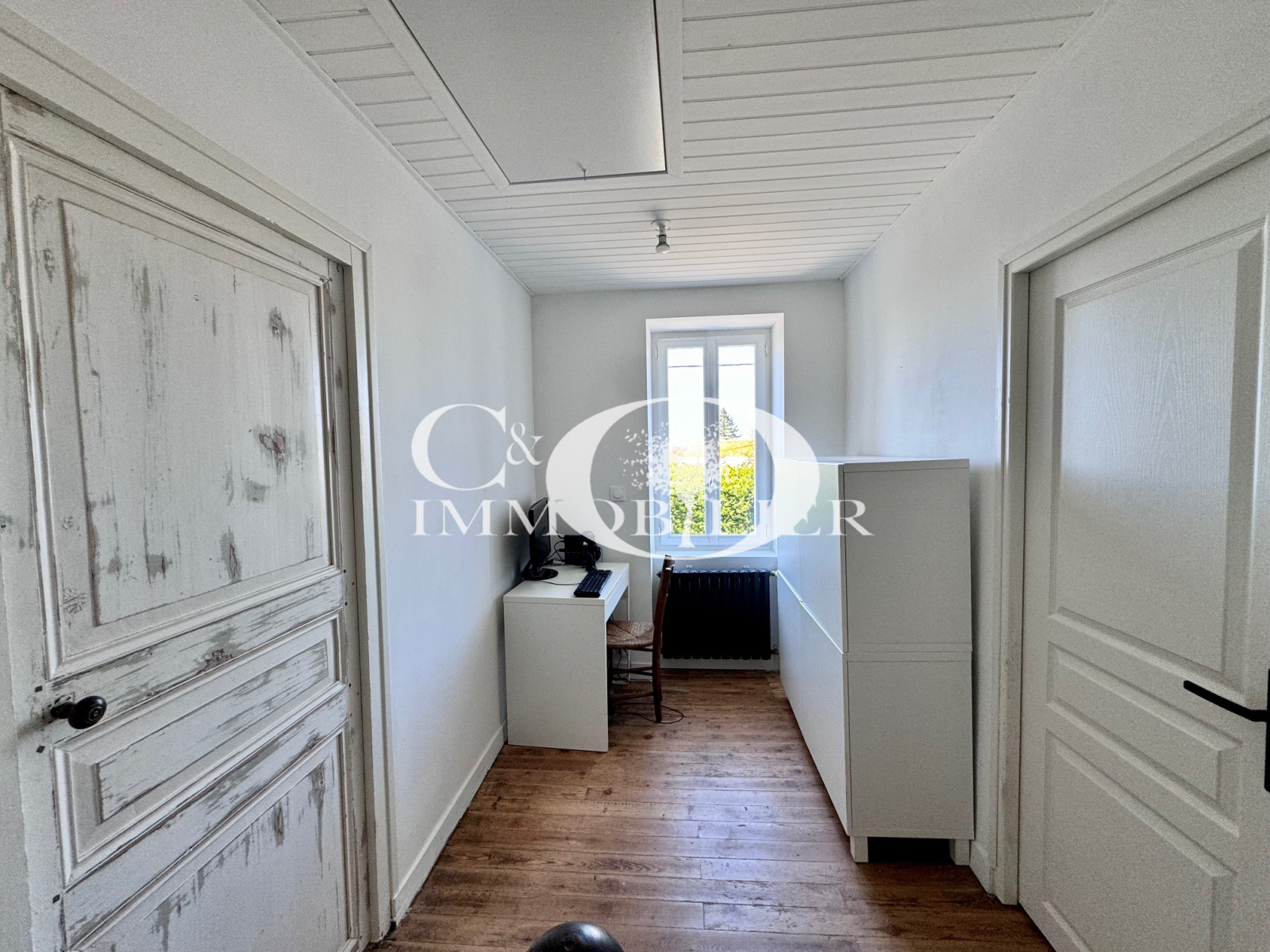 A l'étage se trouve un grand palier qui dessert 2 chambres et une salle d'eau avec wc.