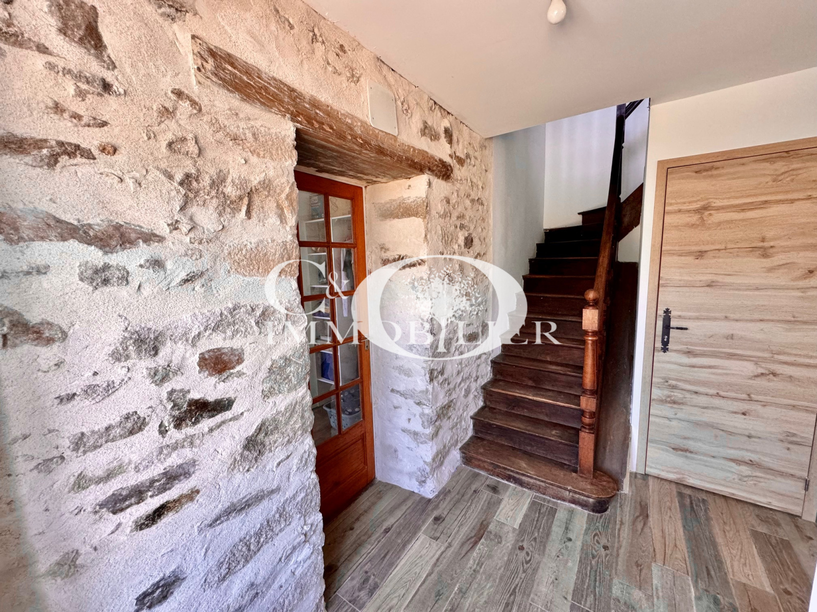 Cette maison pierres située en village a été intégralement rénovée et comprend au rez-de-chaussée : une entrée, un wc avec lave-mains, un salon/séjour, une cuisine meublée et équipée (plaques cuisson gaz, hotte, lave-vaisselle, four électrique et micro-ondes), une chambre avec placard avec un espace salle de bains.