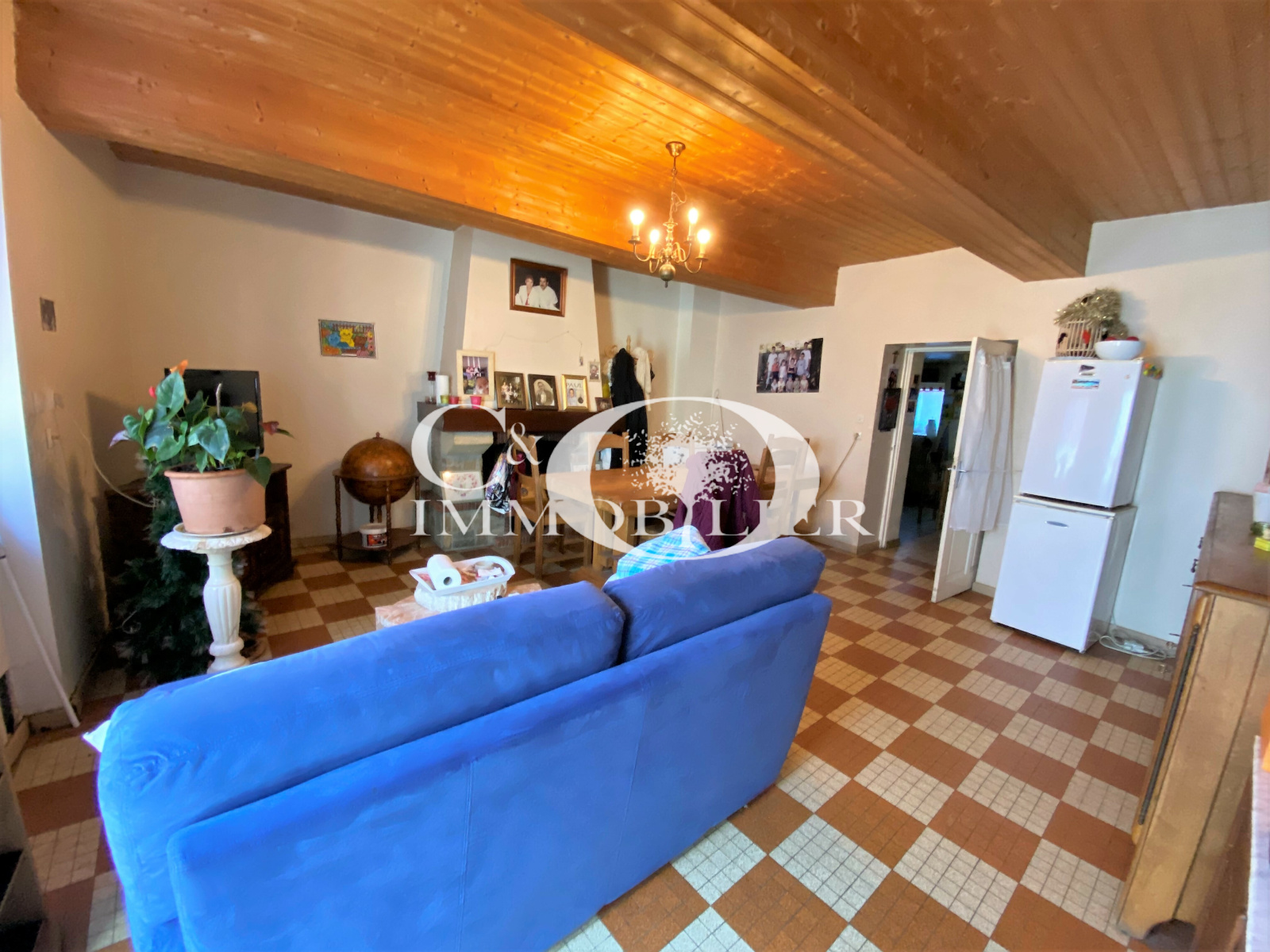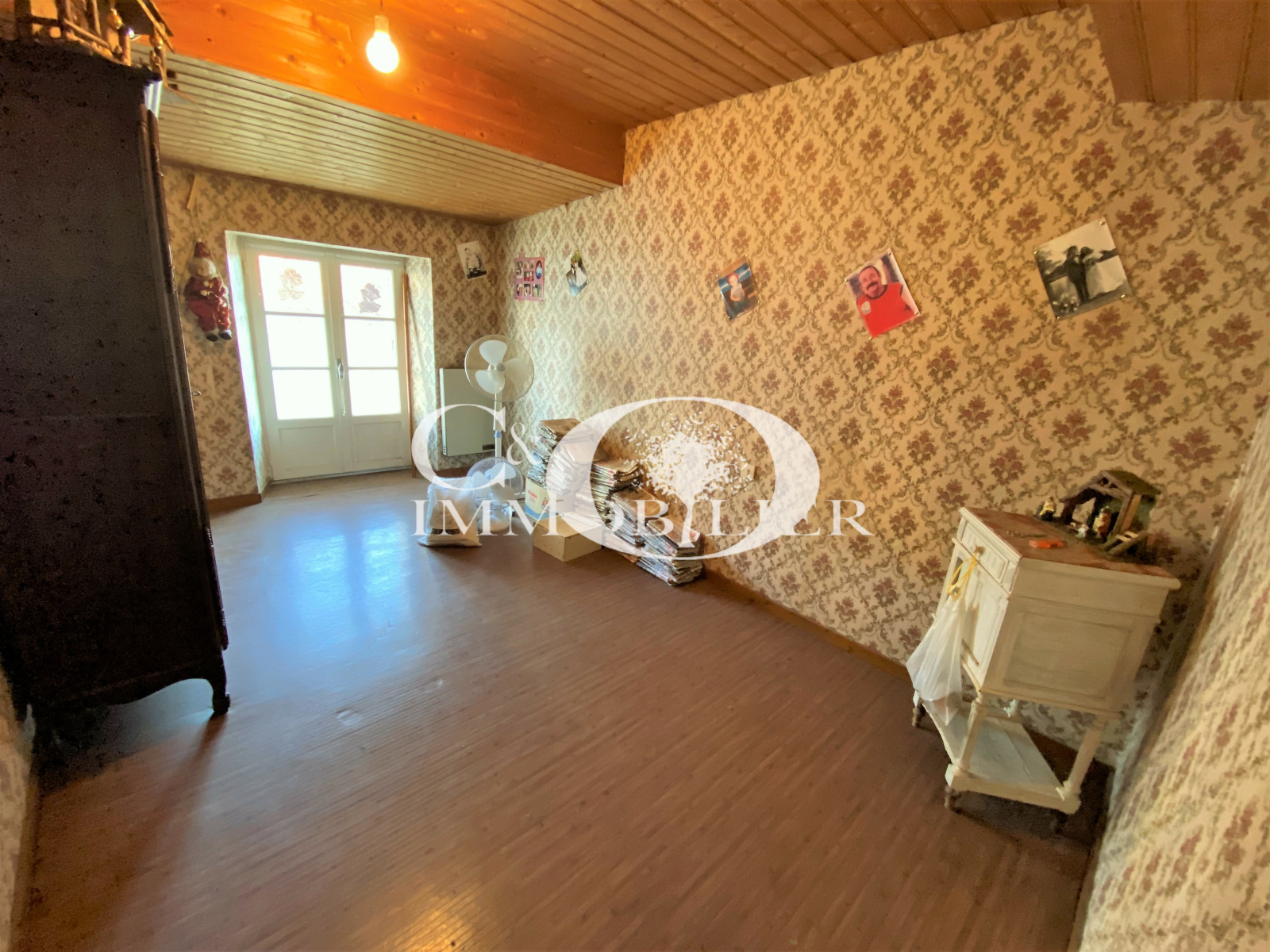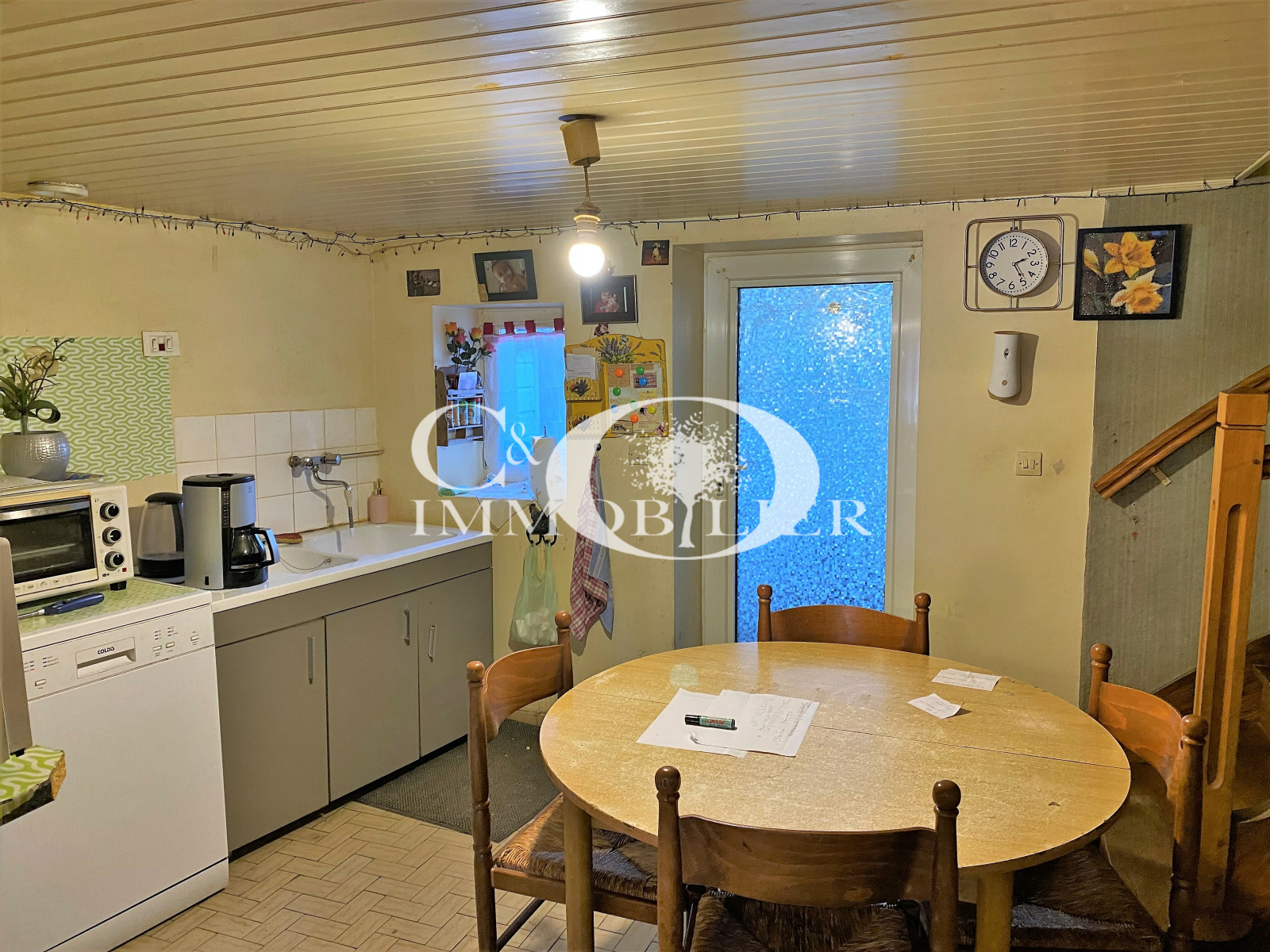 Située dans le bourg, maison sur 2 niveaux avec locataire en place et comprenant au Rdc : séjour avec cheminée, cuisine simple, un wc et une salle de bains.