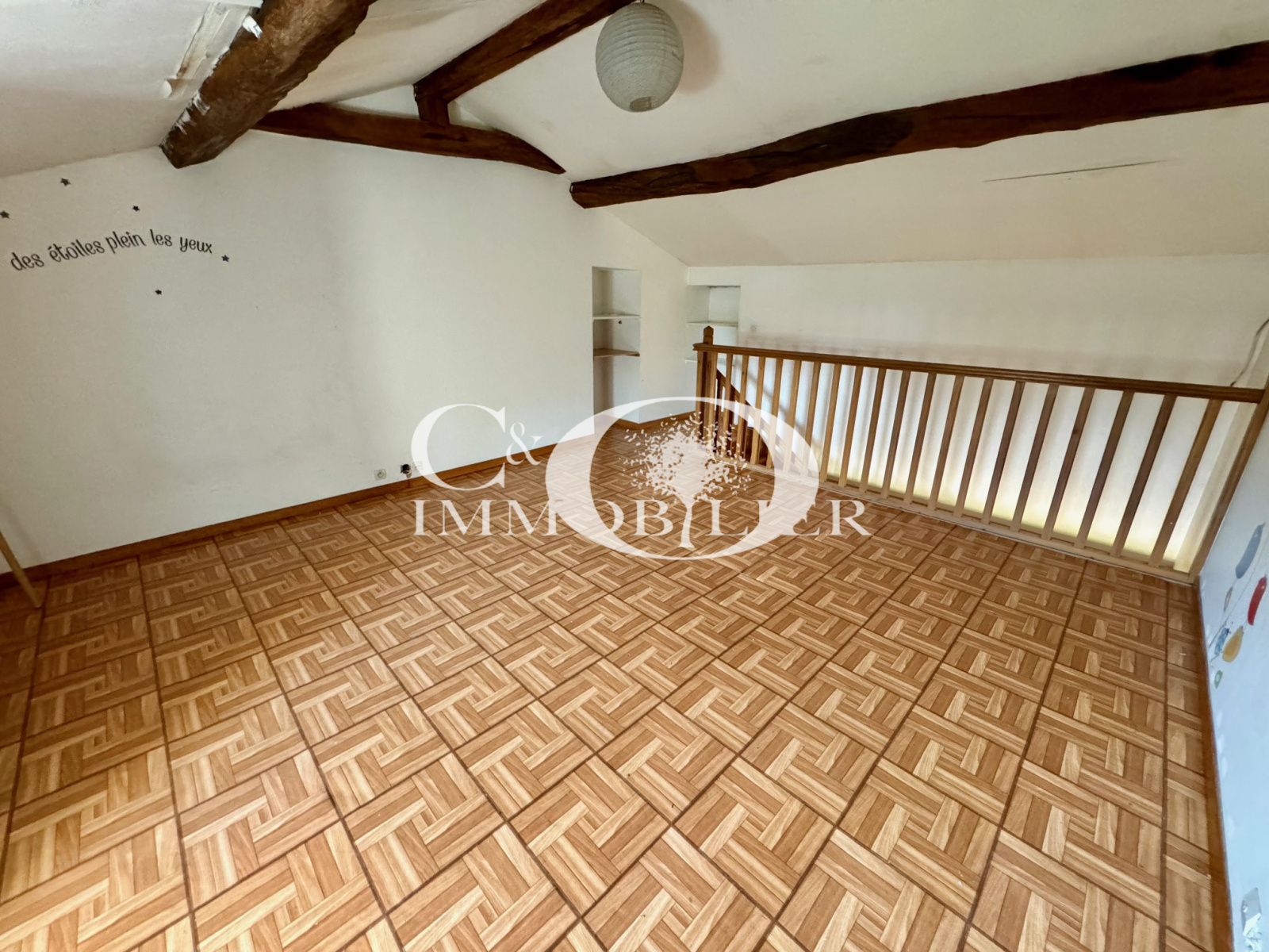 A l'étage se trouve une grande chambre - Plus de 40 m² de combles aménageables actuellement accessibles par un escalier extérieur à l'habitation .