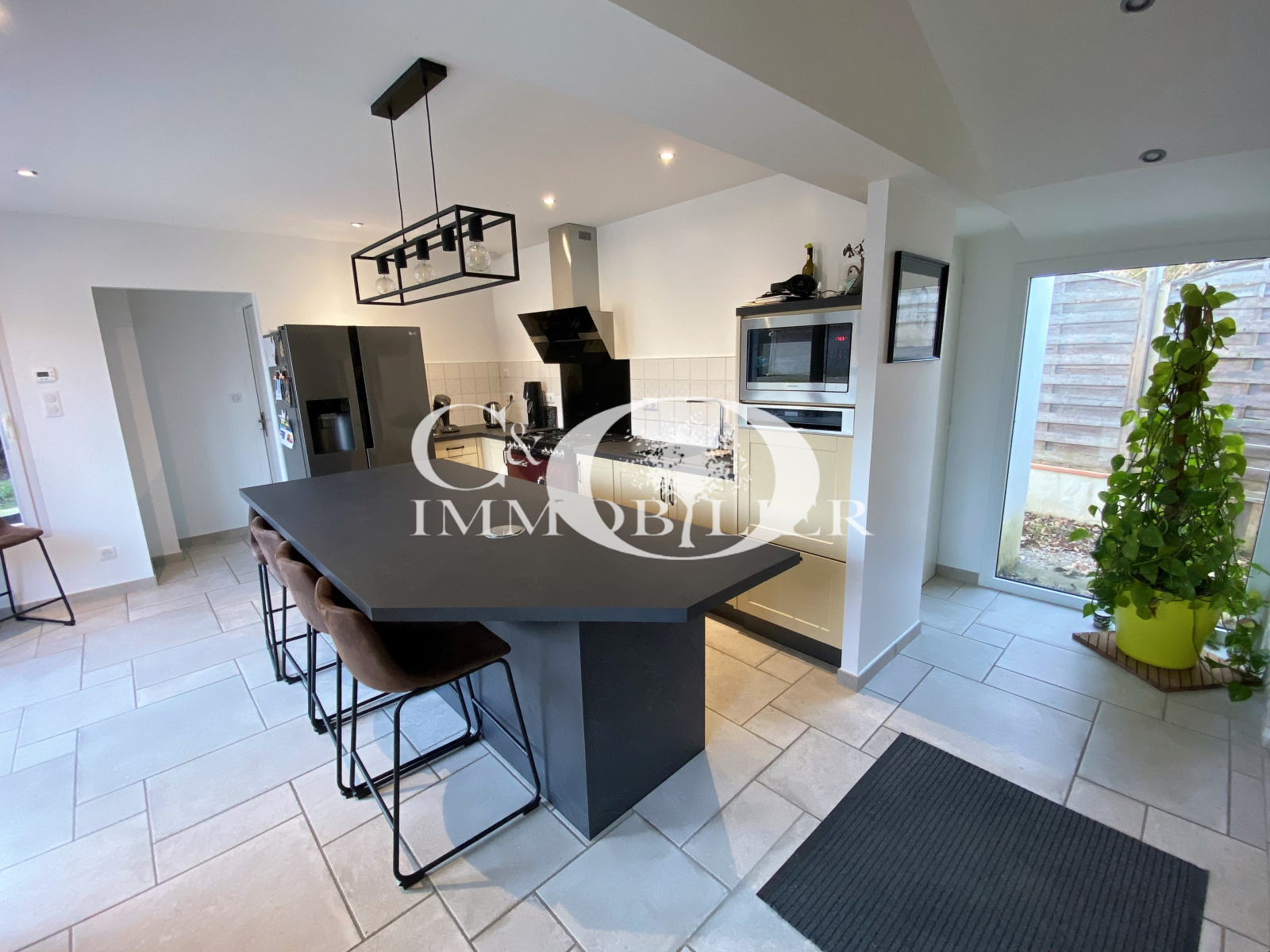 Une 2ème partie suite à une extension réalisée en 2019 comprend une cuisine aménagée et équipée (piano de cuisson, lave-vaisselle, micro-ondes et hotte ), un wc et une suite parentale avec dressing et salle de bains avec douche.