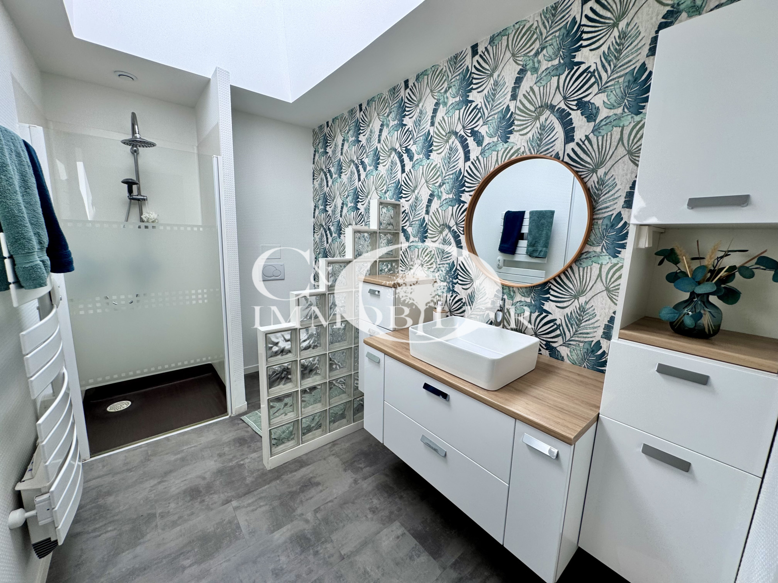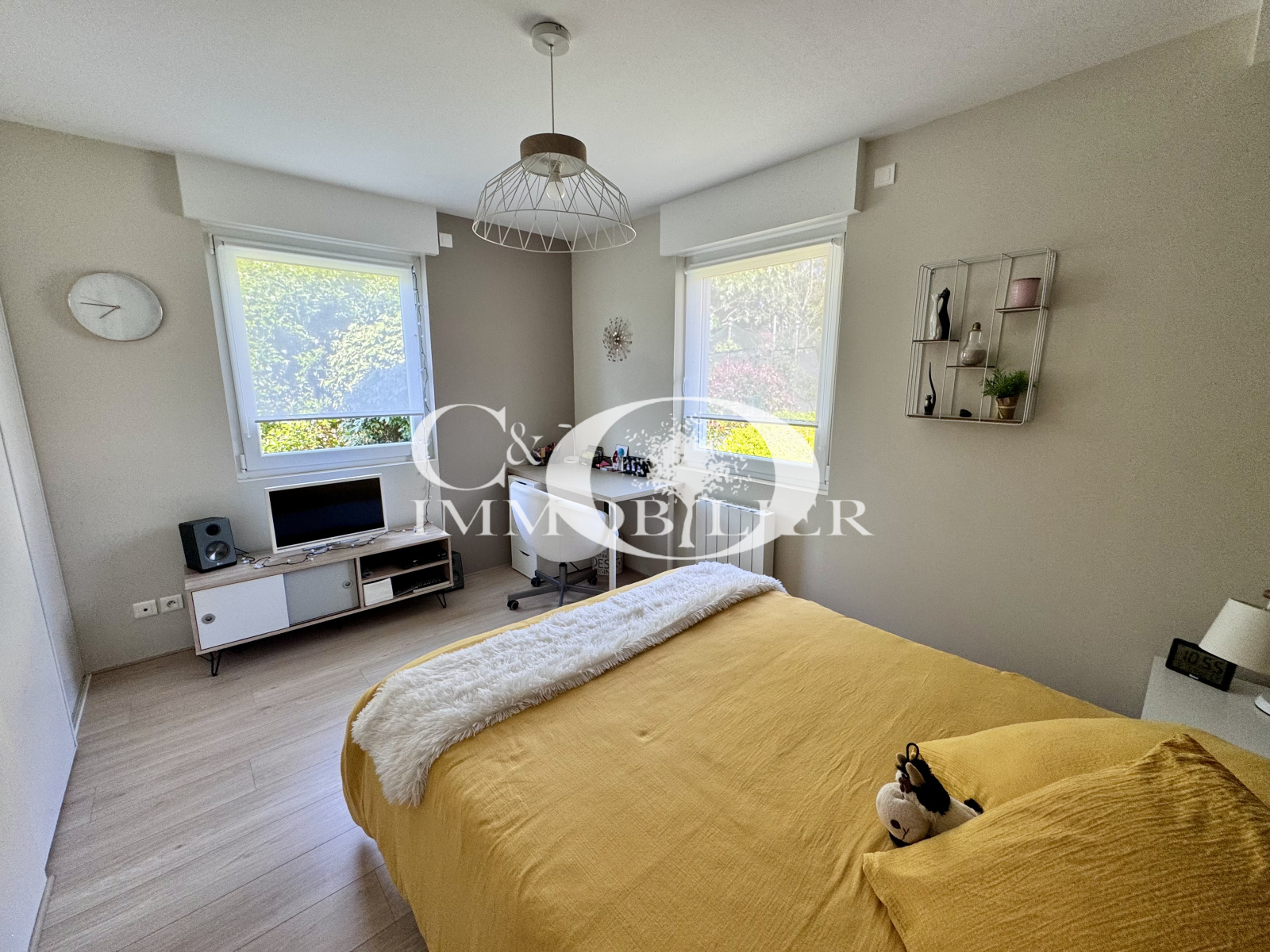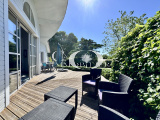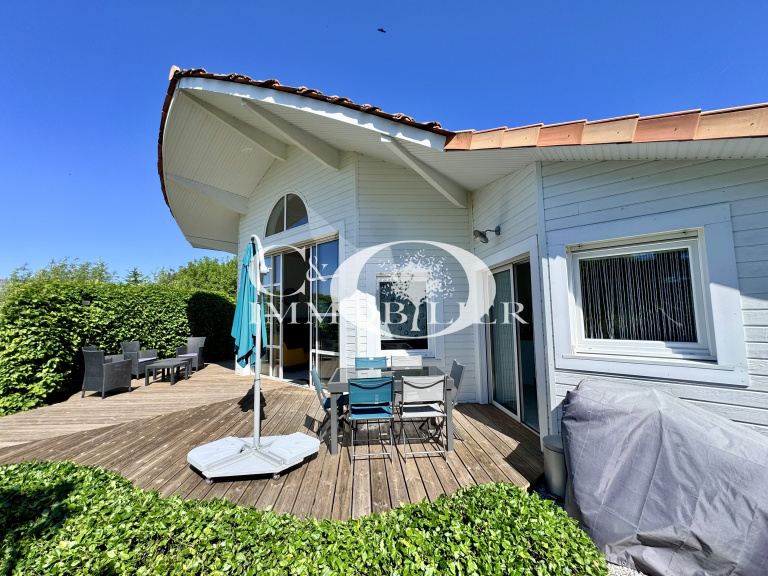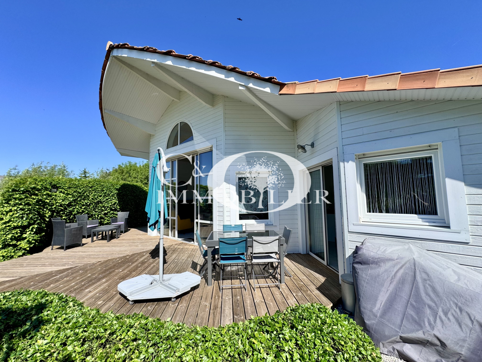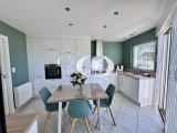 Située en centre bourg sur un terrain arboré et paysagé, cette construction ossature bois très lumineuse et au charme intemporel vous offre un séjour/salon avec un plafond cathédrale donnant sur une terrasse bois.
