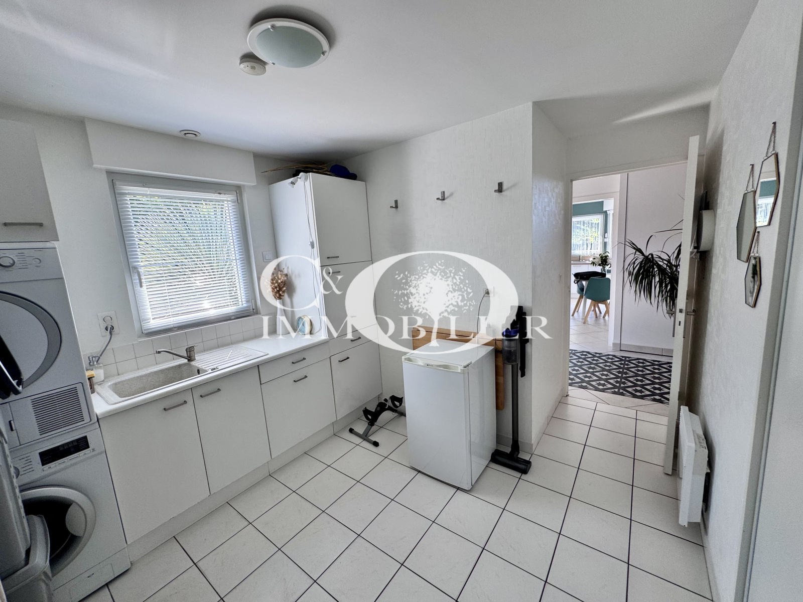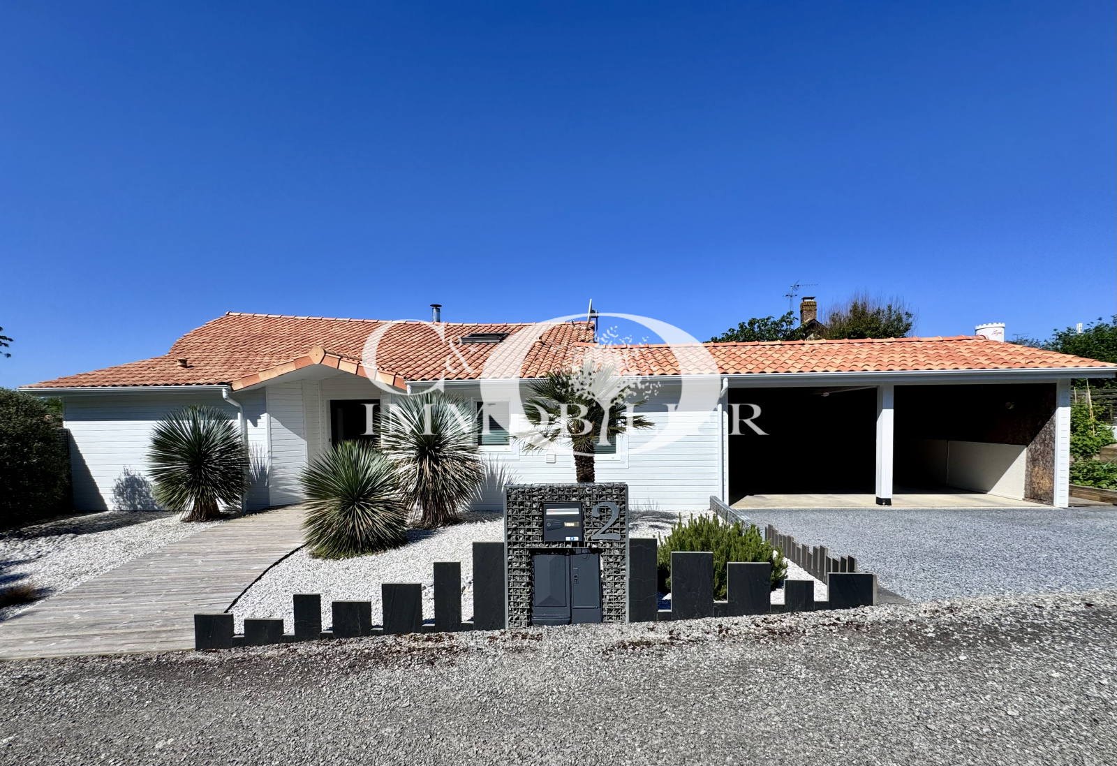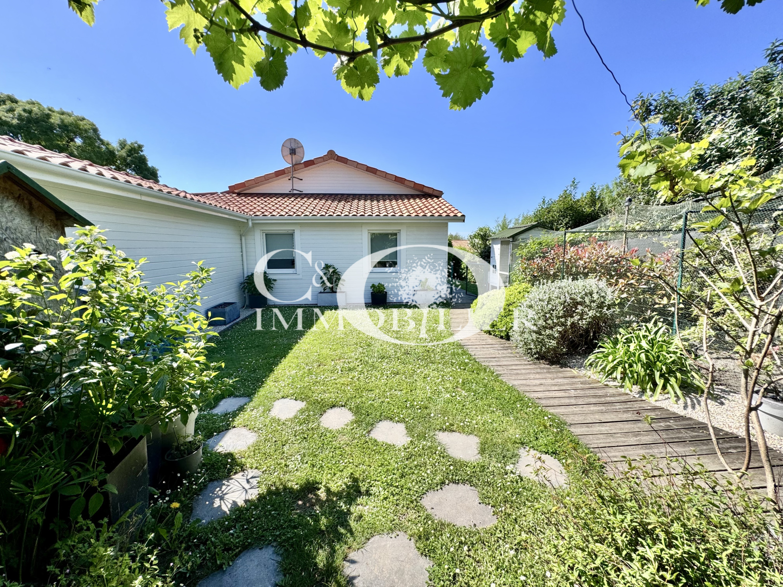 Située en centre bourg sur un terrain arboré et paysagé, cette construction ossature bois très lumineuse et au charme intemporel vous offre un séjour/salon avec un plafond cathédrale donnant sur une terrasse bois.