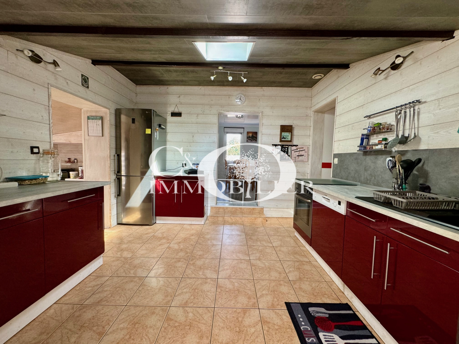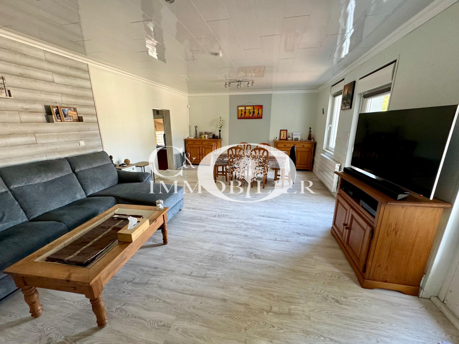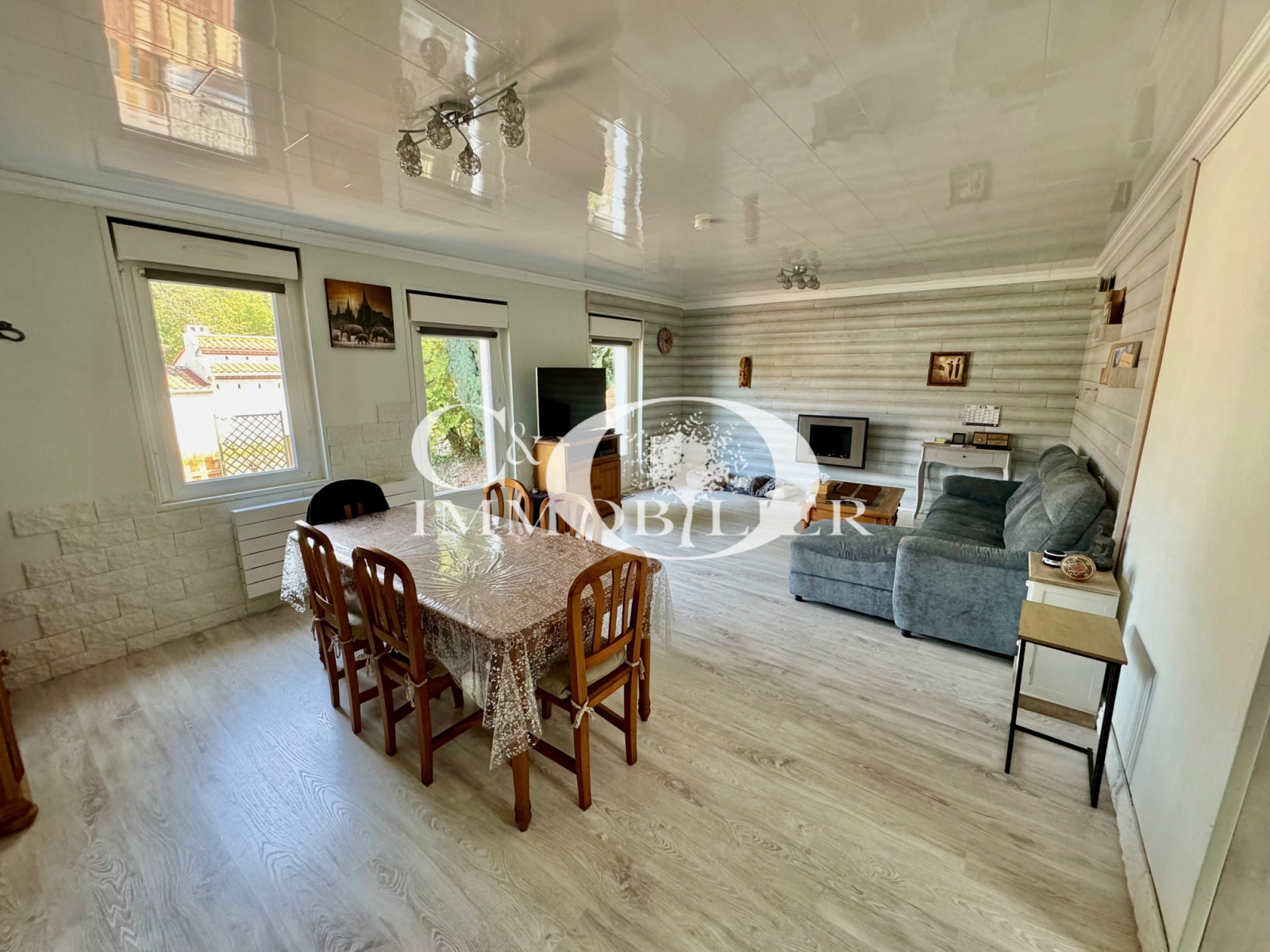 Maison de village entièrement rénovée de 115 m² environ comprenant : une véranda, une cuisine aménagée et équipée (plaques de cuisson, four, lave-vaisselle, réfrigérateur-congélateur), une arrière-cuisine, un salon/séjour avec cheminée à l'éthanol, 3 chambres, une buanderie, un wc et une salle de bains.