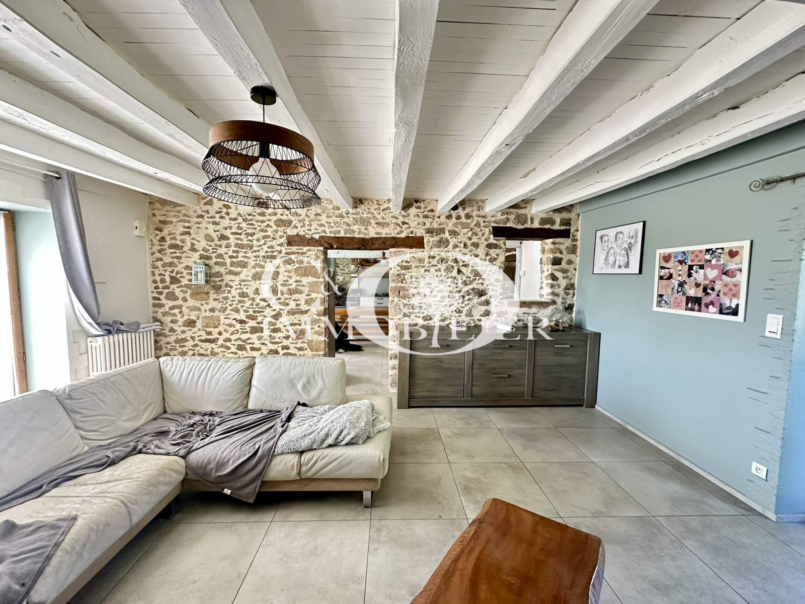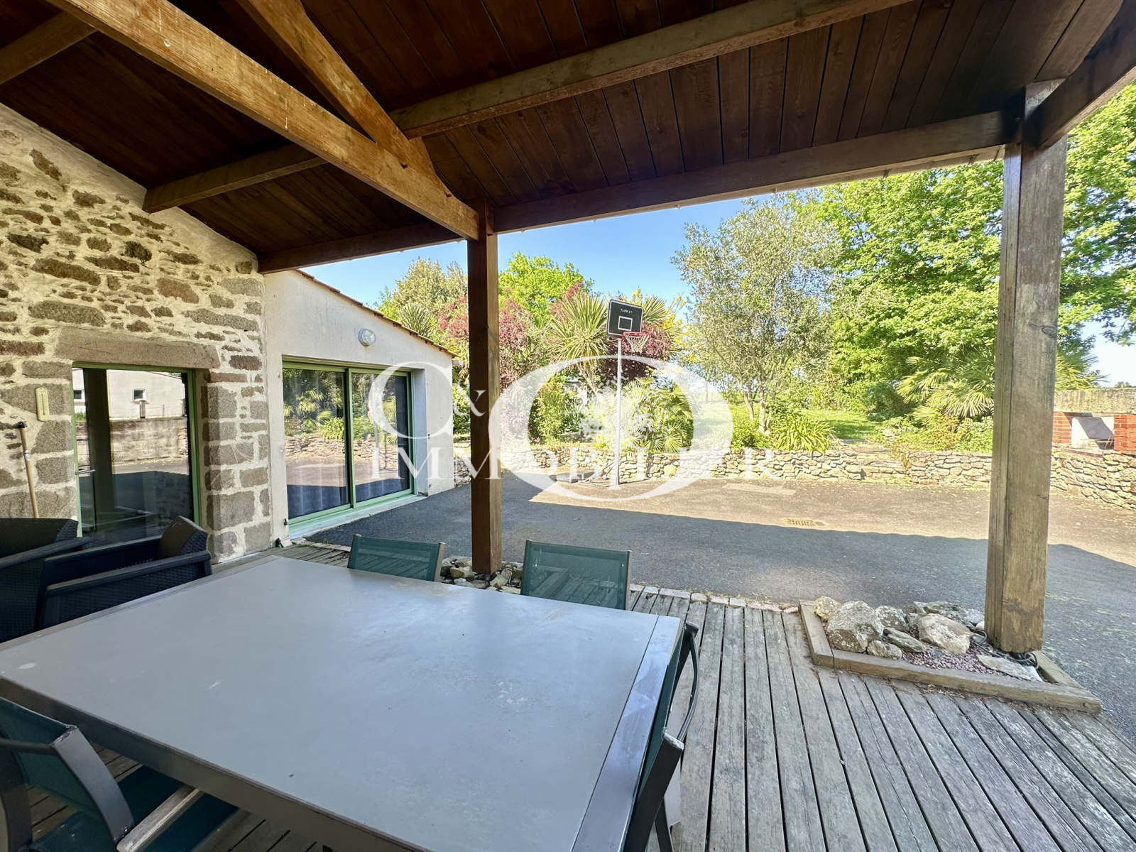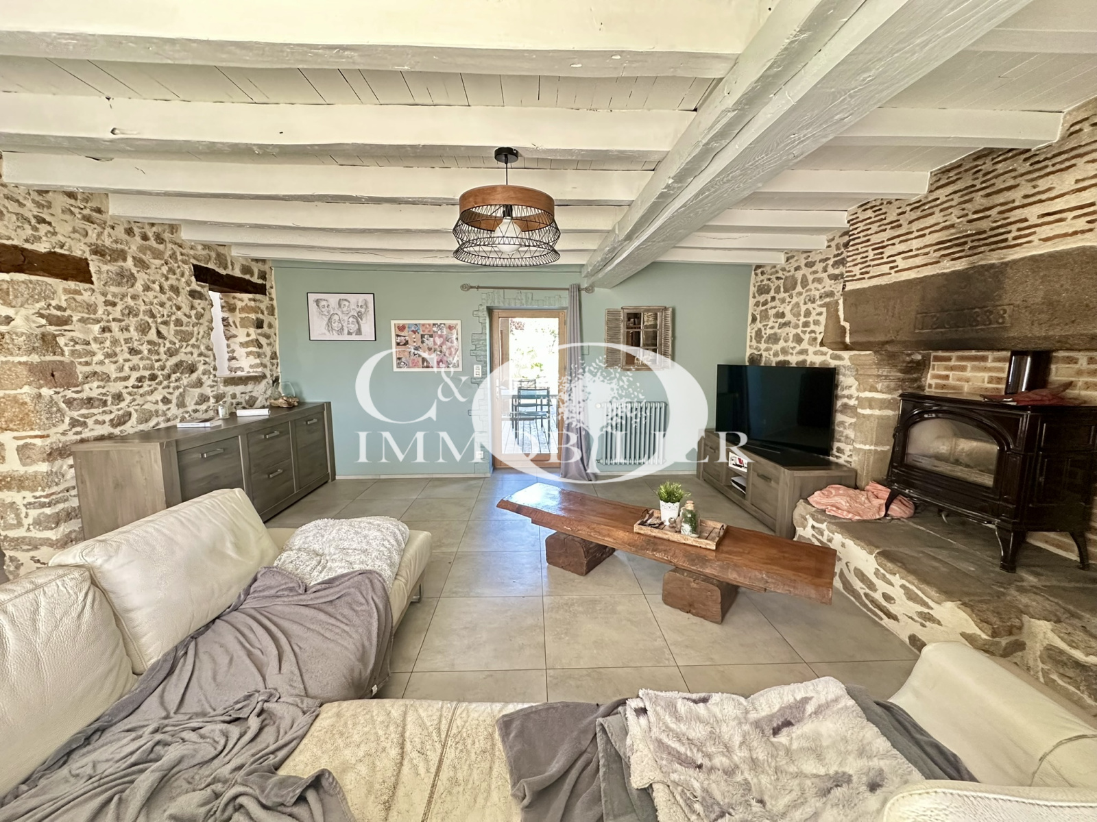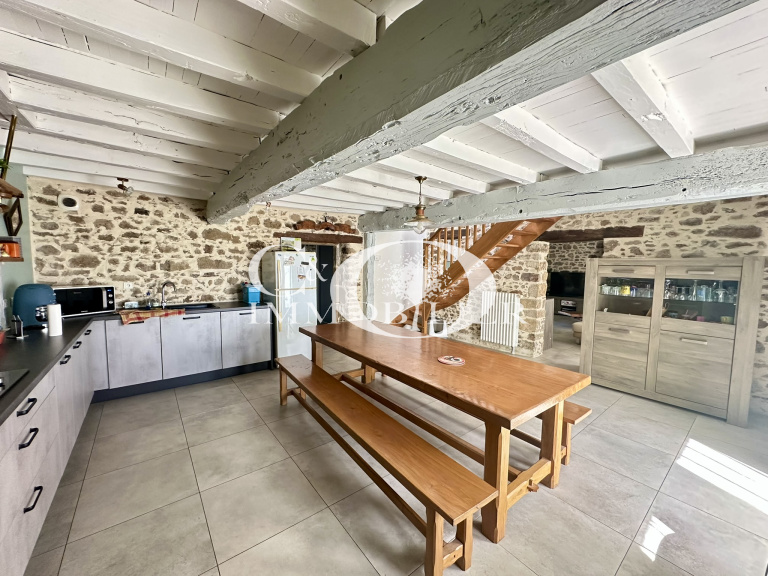 - Située au calme de son village, charmante longère en pierres apparentes. Cet ensemble est édifié sur deux niveaux comprenant au rez-de-chaussée : un bel espace cuisine aménagée et équipée, un salon/séjour avec poêle à bois, une salle d’eau avec wc, cellier et une grande chambre donnant sur le jardin. A l’étage nous retrouvons 3 chambres, une salle de bains et un wc séparé. Le tout sur un terrain de 1393 m² avec garage, chaufferie, terrasse couverte, dépendance et cave.