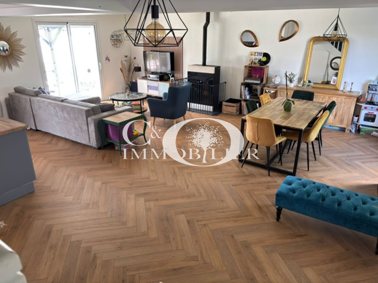 **OPPORTUNITE CO IMMOBILIER** à découvrir pour cette belle maison idéalement située proche de toutes commodités à pied comprenant au rez-de-chaussée : Une très belle et grande pièce de vie d'environ 55 m² sur parquet avec sa cuisine AE et son coin salon salle à manger avec son poêle à granules, un cellier, un wc, un garage.