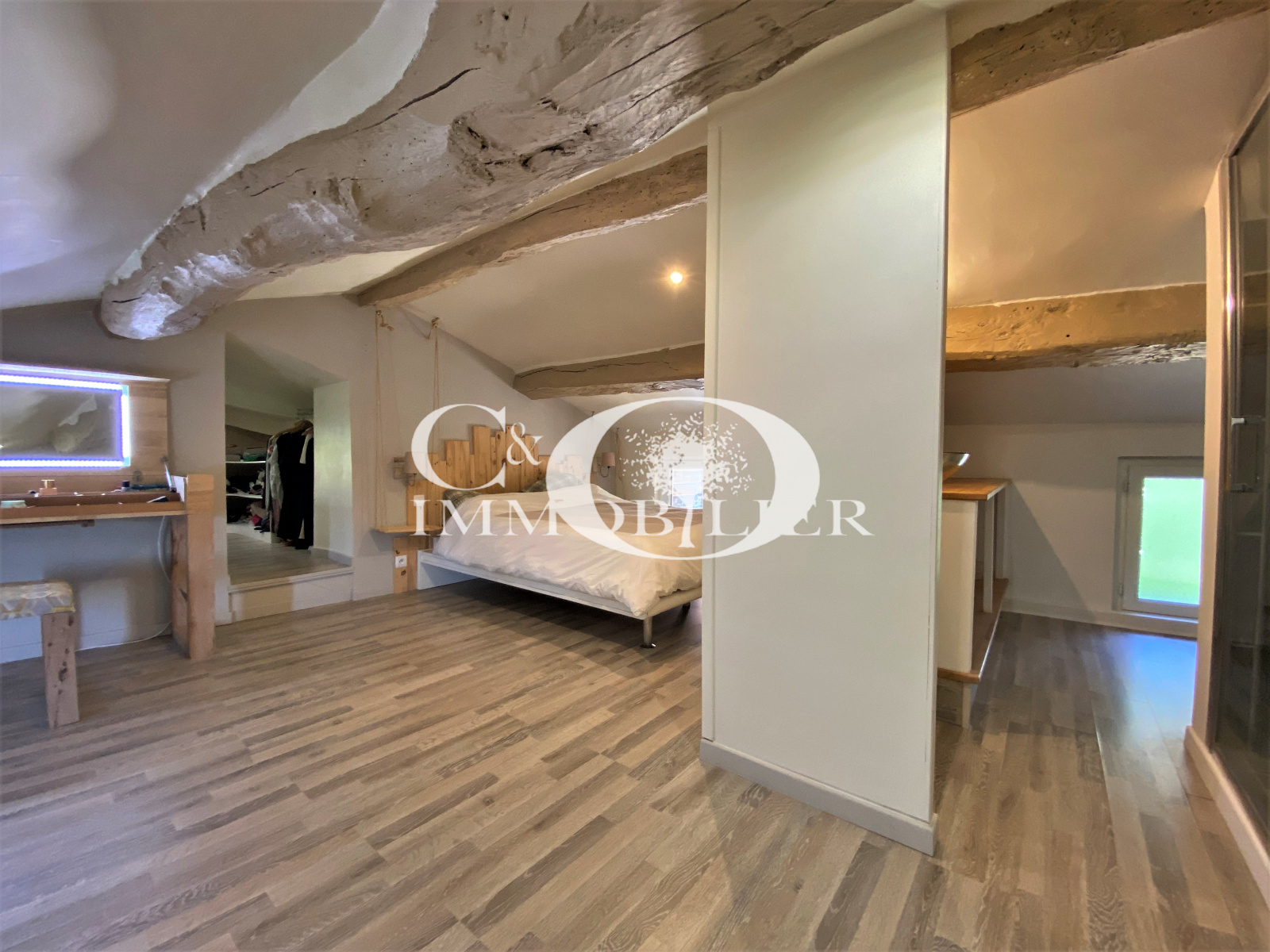 - Située au calme de son village, très belle propriété d’une surface de 145 m² se composant ainsi : Une hall d’entrée, un grand espace de vie (salon/salle à manger), une cuisine (A/E), un coin buanderie, un dégagement desservant 2 chambres, un wc et une salle bains. A l’étage nous retrouvons un palier/bureau et une suite parentale (mansardée) avec un coin douche et un espace dressing.