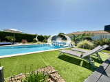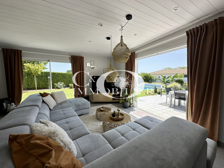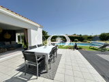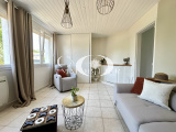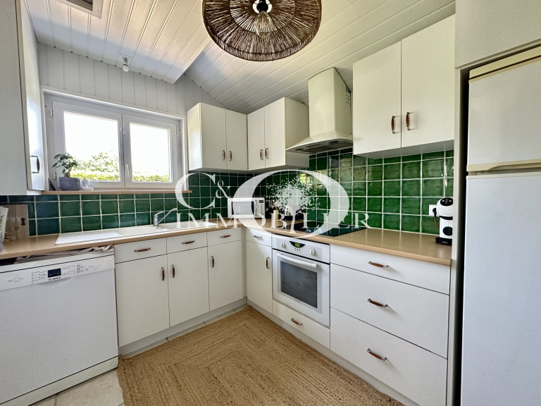 Pour le reste de la villa, nous retrouvons : une cuisine aménagée et équipée, trois chambres, d'une salle d'eau comprenant meubles haut et bas, douche et sèche-serviettes, ainsi que d'un WC indépendants. Un second salon (pouvant faire office d'un bureau ou d'une autre chambre) avec cheminée complète l'ensemble.