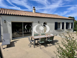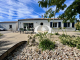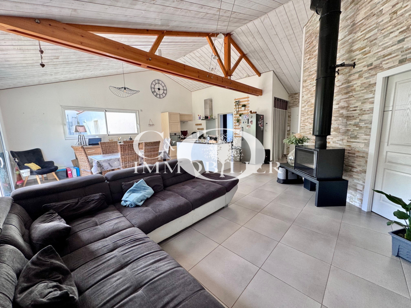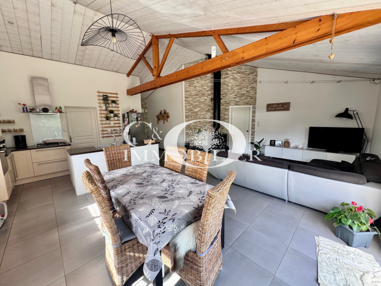 Située proche du centre bourg, cette maison de plain-pied de 2013 comprend : un hall d’entrée avec placard, une buanderie, une cuisine aménagée et équipée (une hotte, plaque de cuisson gaz, un lave-vaisselle, un four), un salon-salle à manger de 46 m² environ avec un poêle à bois et donnant sur une grande terrasse.