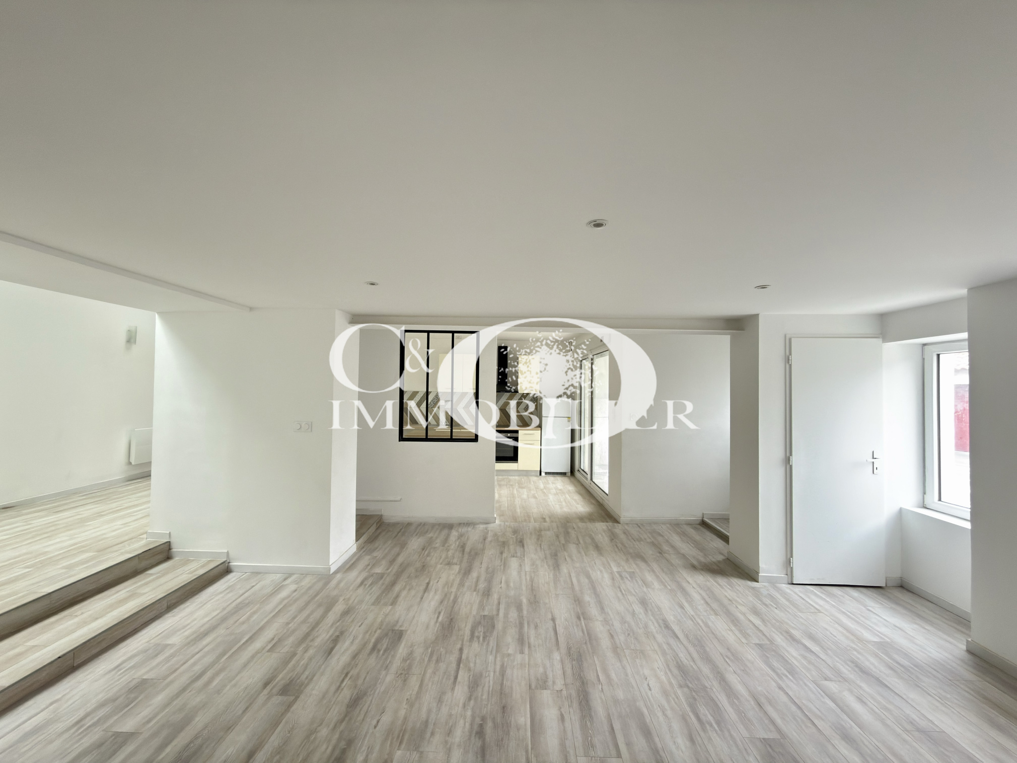 - Située dans le centre de La Bénâte, maison d’habitation entièrement rénovée sur deux niveaux, comprenant au rez-de-chaussée : une entrée donnant sur un espace salon/séjour, une lingerie, un WC, ainsi qu’une cuisine partiellement équipée (four, hotte et plaques électriques) semi-ouverte sur la salle à manger.