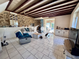 Au rez-de-chaussée, vous découvrirez un salon/séjour chaleureux équipé d’un poêle à pellets, une cuisine aménagée et équipée (plaques de cuisson et hotte), un WC indépendant ainsi qu’une buanderie.