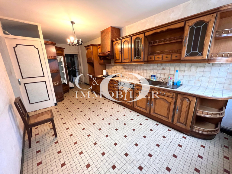 Située dans le bourg, maison à rénover comprenant au rdc : une pièce de vie avec cheminée, une cuisine séparée aménagée et équipée, une arrière cuisine avec cheminée, un WC séparé, une salle d'eau et une dépendance en pierres d'environ 70 m² attenante à la maison et avec un puits.